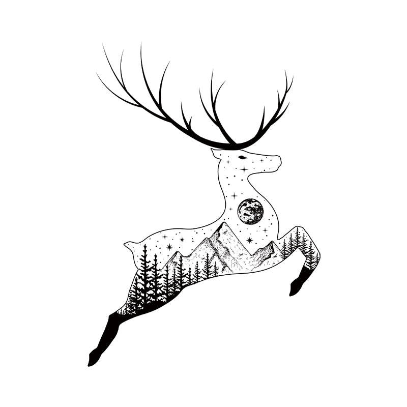 This design portrays a leaping stag whose body carries an entire nocturnal world—stars, mountains, and forest. It symbolizes transcendence and... Read more