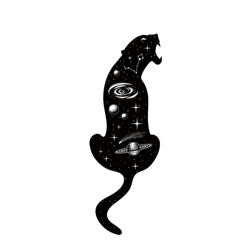 A cosmic puma etched in black, roaring through a galaxy-strewn body. This design channels the primal force of nature fused... Read more