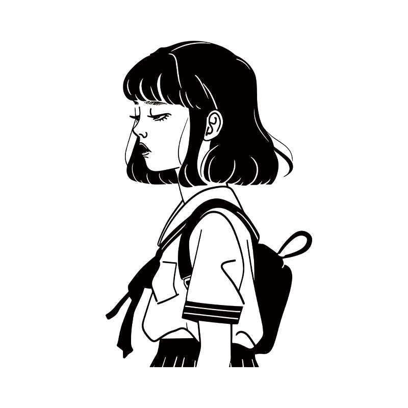 A side portrait of a girl whose half-lidded eyes look through the world, not at it. Her backpack clings like... Read more