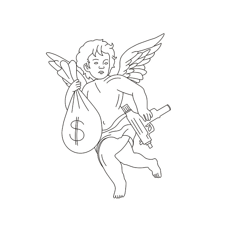 A mischievous Cupid, clutching a bag of stolen riches and an Uzi gun, blends love with rebellion—dancing on the thin... Read more