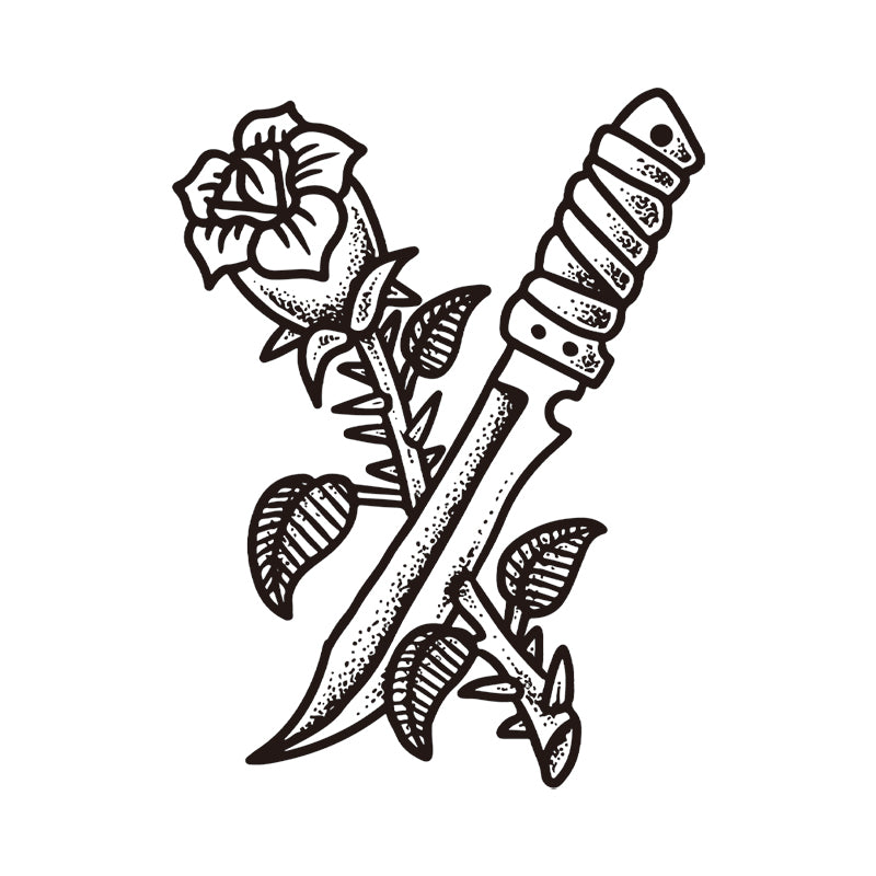 This tattoo design combines a rose stem and a dagger, entwined in symbolic tension. The style uses bold outlines and... Read more
