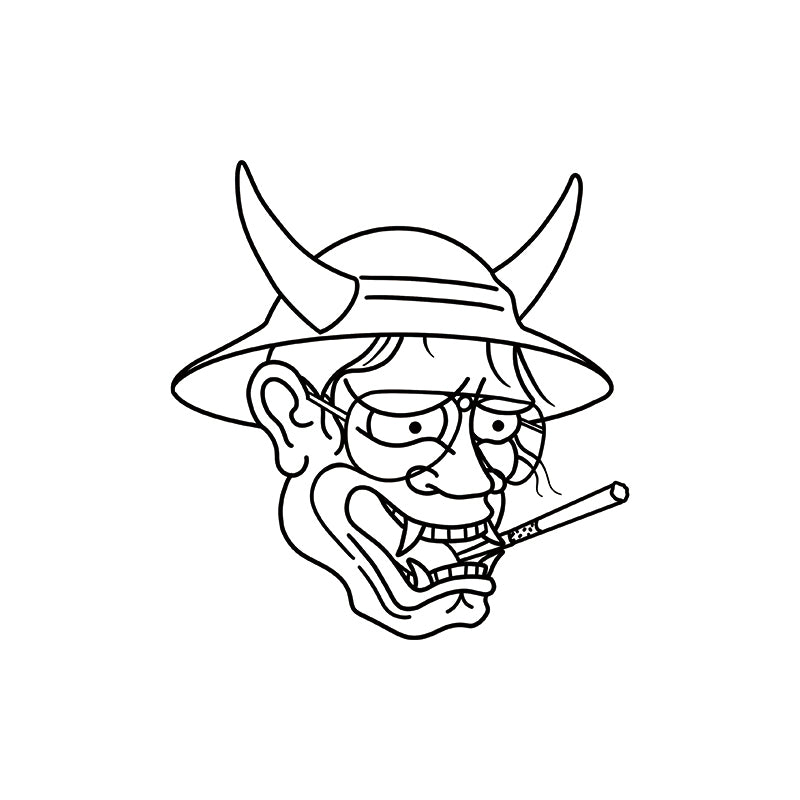 A twist on the fearsome folklore demon—this two-horned Oni lounges with a cigarette dangling from his mouth and a weathered... Read more