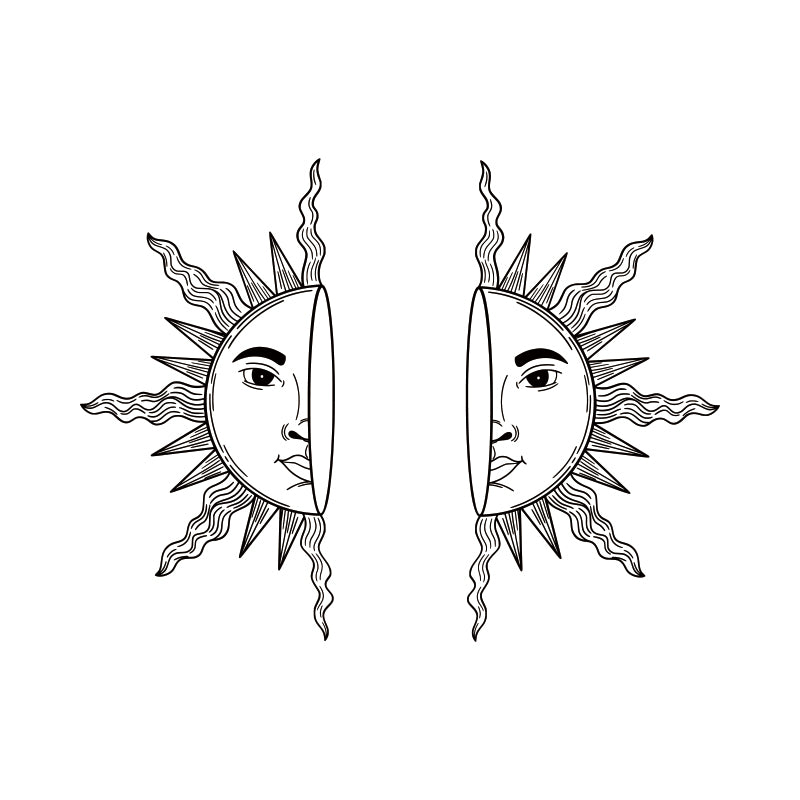 Split sun faces orbiting each other in mirrored halves. Elegant and mystical, this design suits pairs who radiate warmth and... Read more