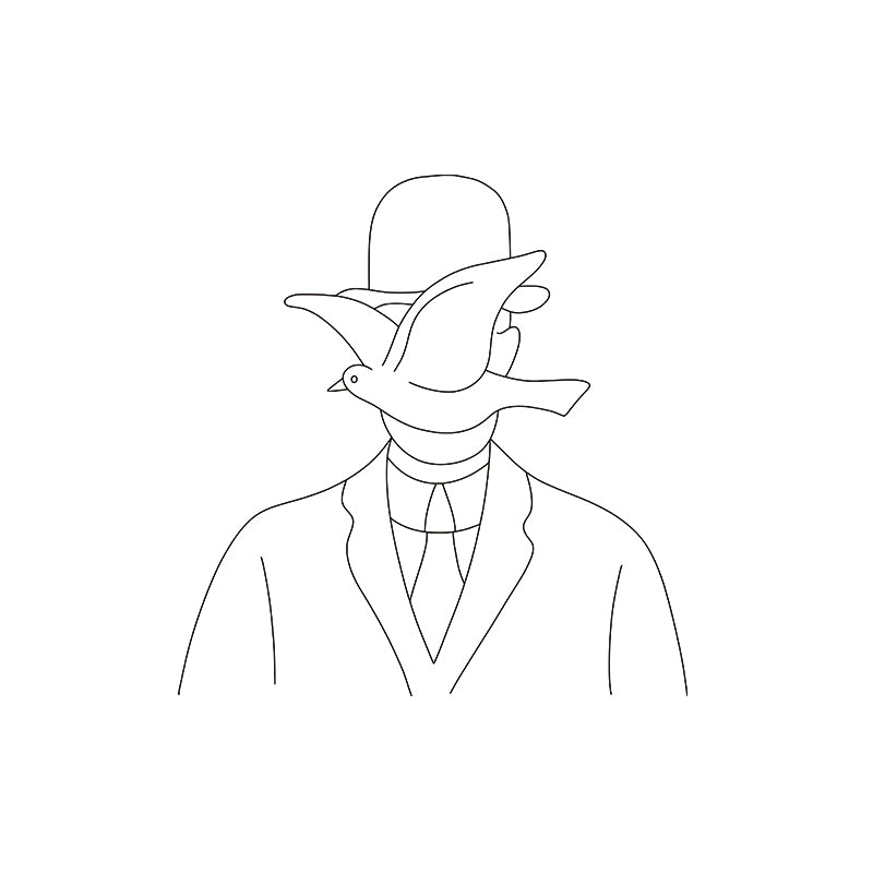 A man in a hat stands as a pigeon flies past, covering his face—an homage to Magritte’s The Son of... Read more