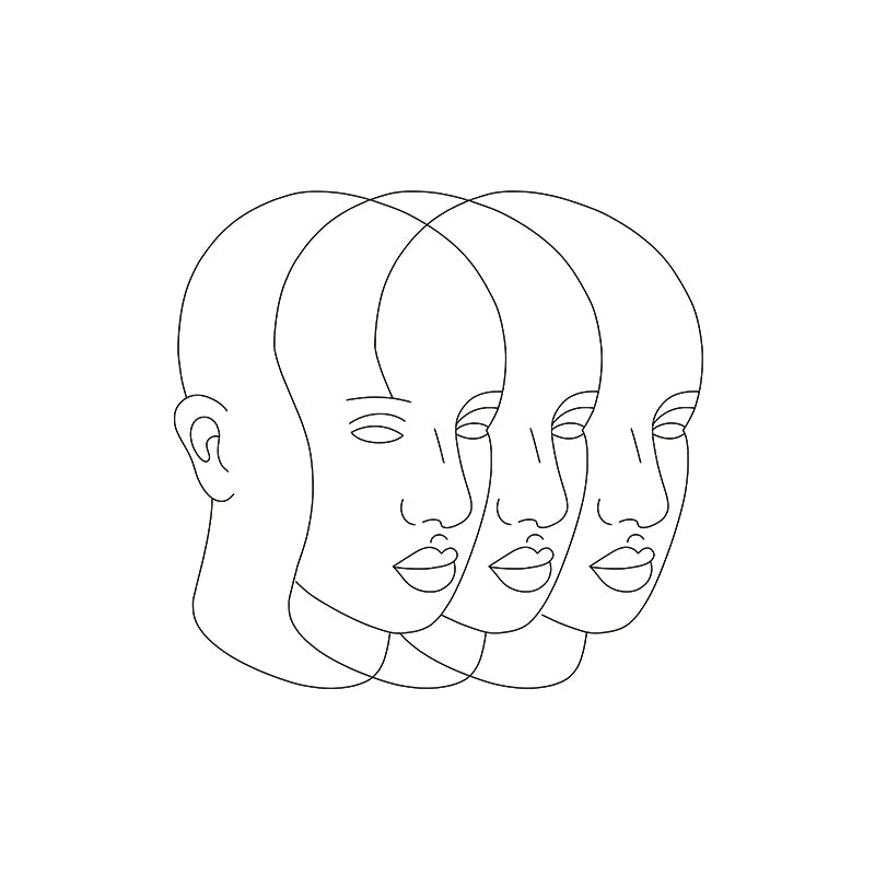 Three layered heads overlap, each with full facial features except a single ear—evoking fragmented perception, shifting identities, and life’s complex... Read more