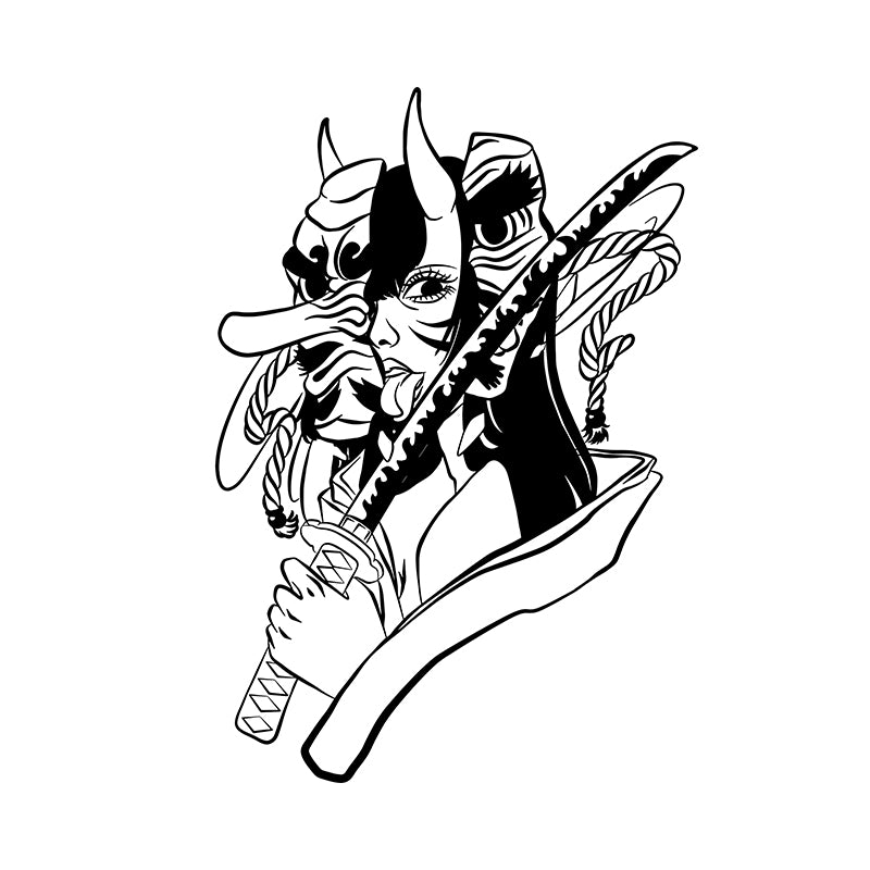 A horned woman slices her tengu mask in two, revealing a taunting, unyielding gaze beneath. This Neo-Japanese design embodies fearless... Read more
