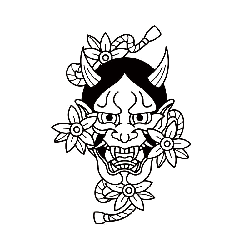 A fierce Hannya mask, sharp horns and haunting eyes wide, emerges from a bed of blossoms—symbols of fleeting beauty and... Read more